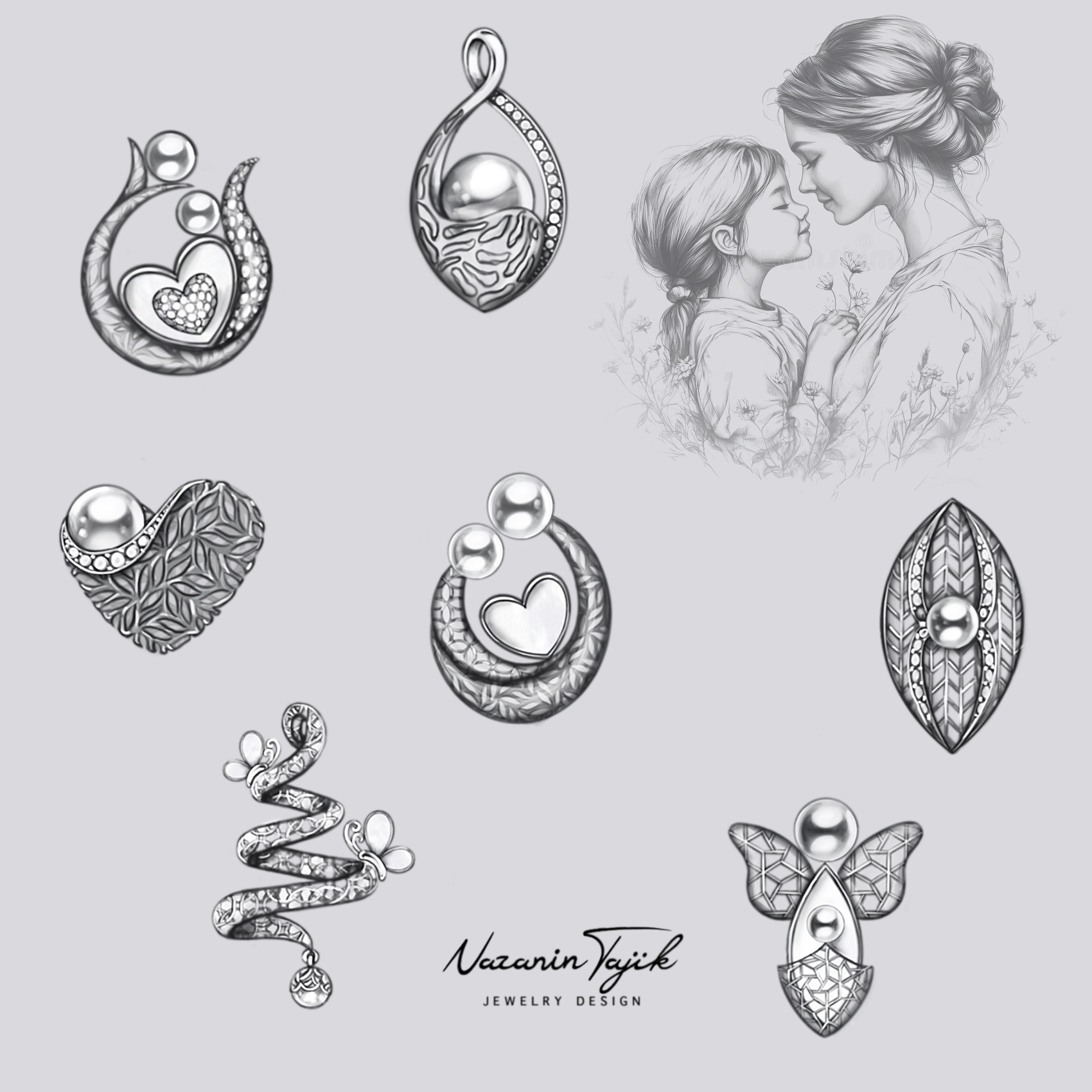 Motherhood pendant concepts by Nazanin Tajik—hearts, leaves, and luminous orbs with a gentle mother–child sketch; elegant, symbolic jewelry ideas.