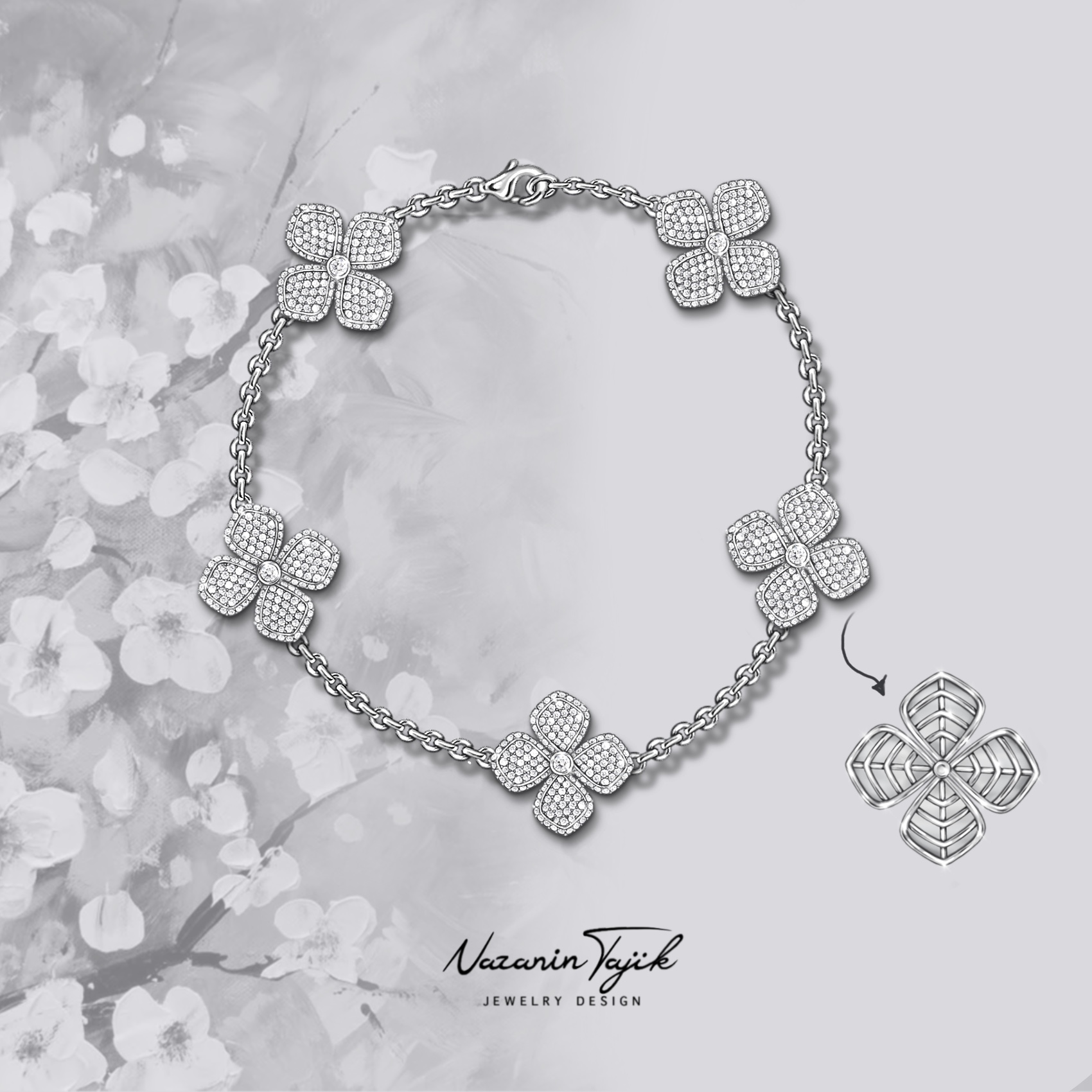 Floral bracelet sketch by Nazanin Tajik featuring pavé-style four-petal motifs on a chain, with inset of the under-gallery design—elegant concept rendering.