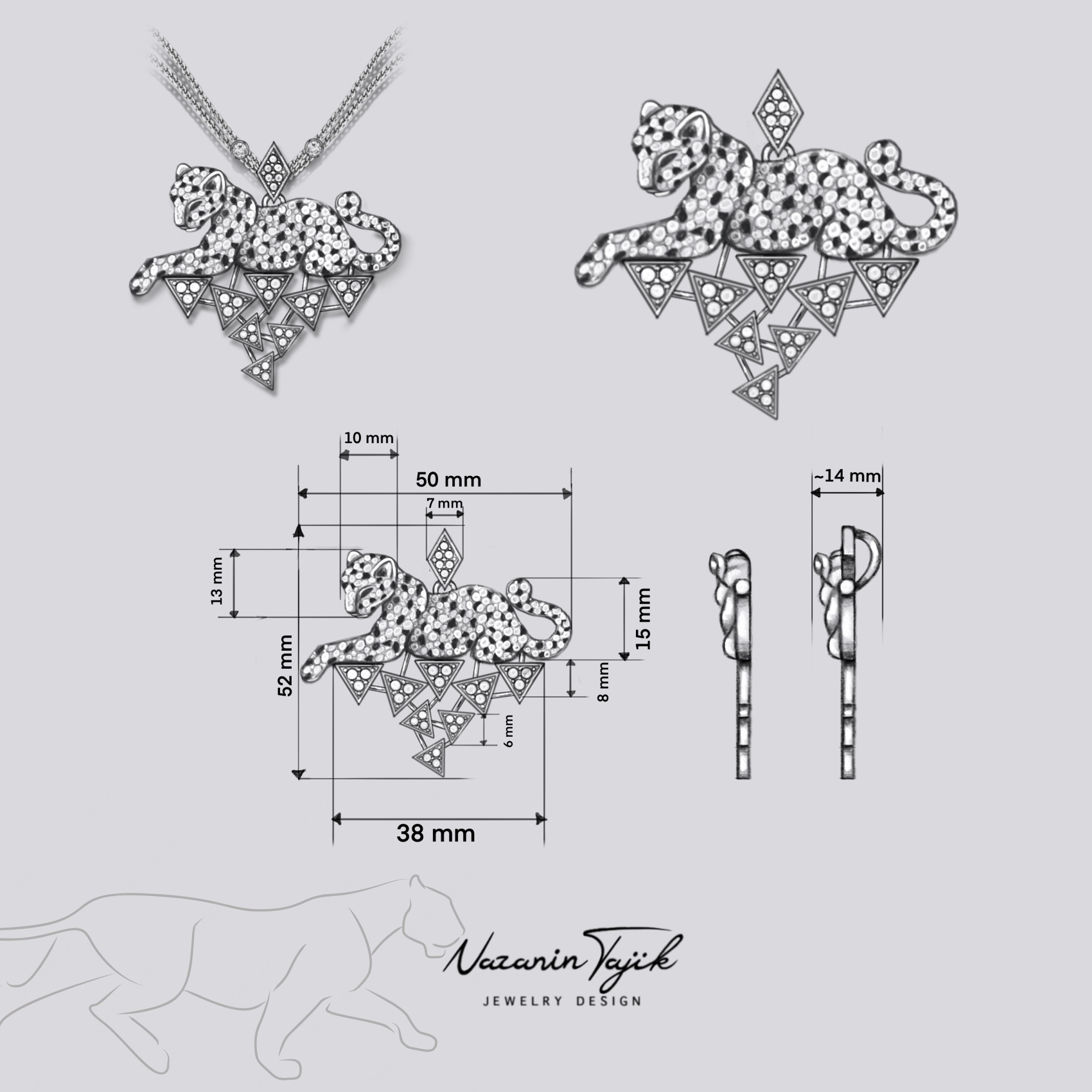 Leopard pendant sketch by Nazanin Tajik—pavé cat with geometric triangle drops, presented with front/side views and precise dimensions for fabrication.